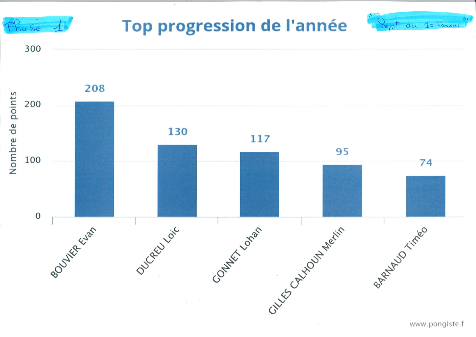 Notre benjamin Evan Bouvier(-11ans) est en tête du classement des meilleures progressions à mi-parcours avec un remarquable + 208 points. Il passe du classement 8 à 10 en ayant au passage 80% de victoires au classement 11, ce qui en dit long sur ses ambitions en 2nde phase ou il évoluera en Régional en équipes et en National en individuel.